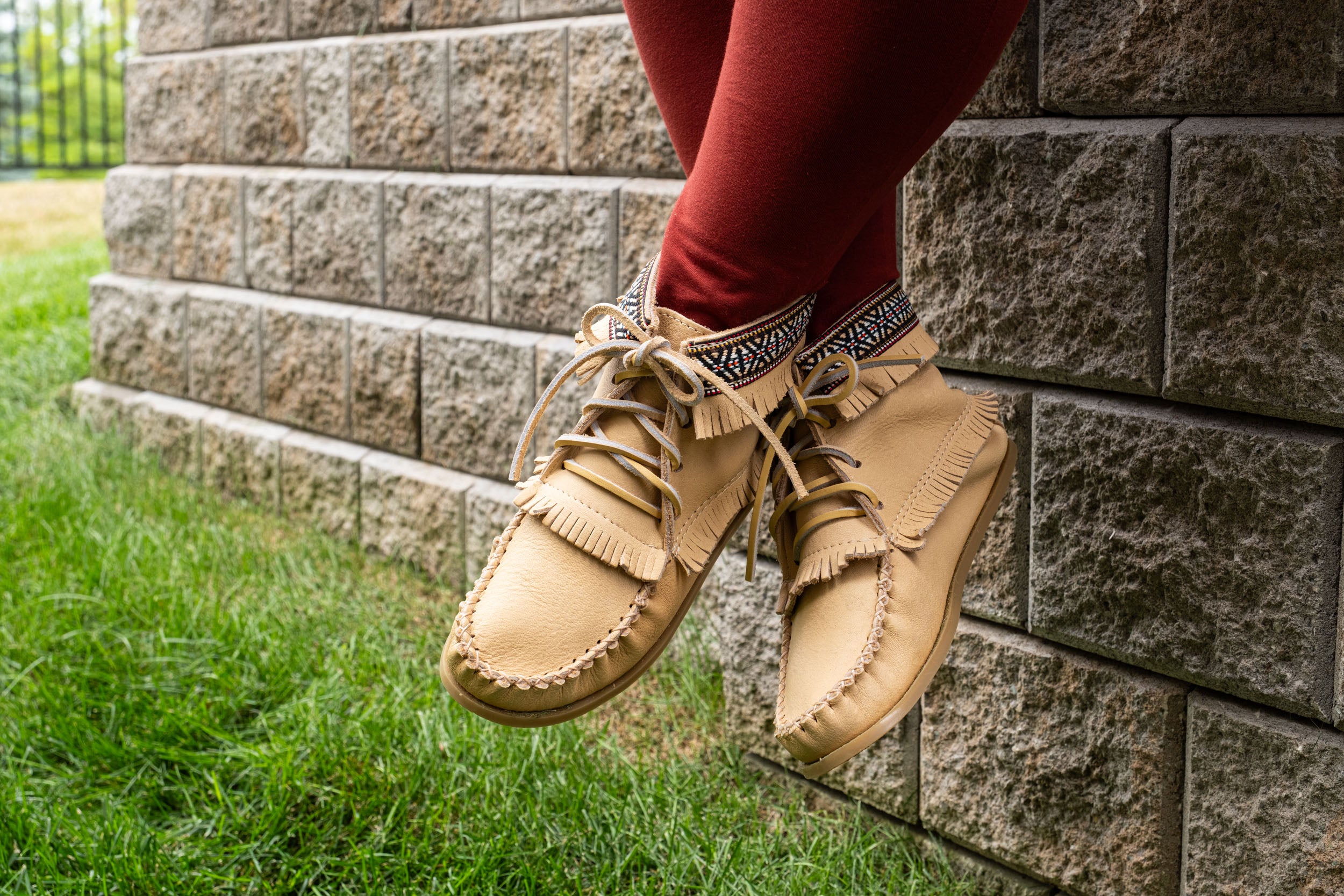 "The Happy Mistake". These boots combine authentic Indigenous-style with modern comfort. The unique ivory colour makes them one-of-a-kind, while the ankle heights and Native-style braid at the top give them cultural charm. Made from genuine moose hide leather, the interior is suede with a padded insole of the perfect amount of cushioning. They feature a durable rubber sole and a lace-up design for a perfect fit. We carry ladies' sizes 5-10. They fit the same as your regular shoe size; for half sizes, go down to the nearest full size (8 ½ order size 8). Don't delay, these boots are selling out fast!