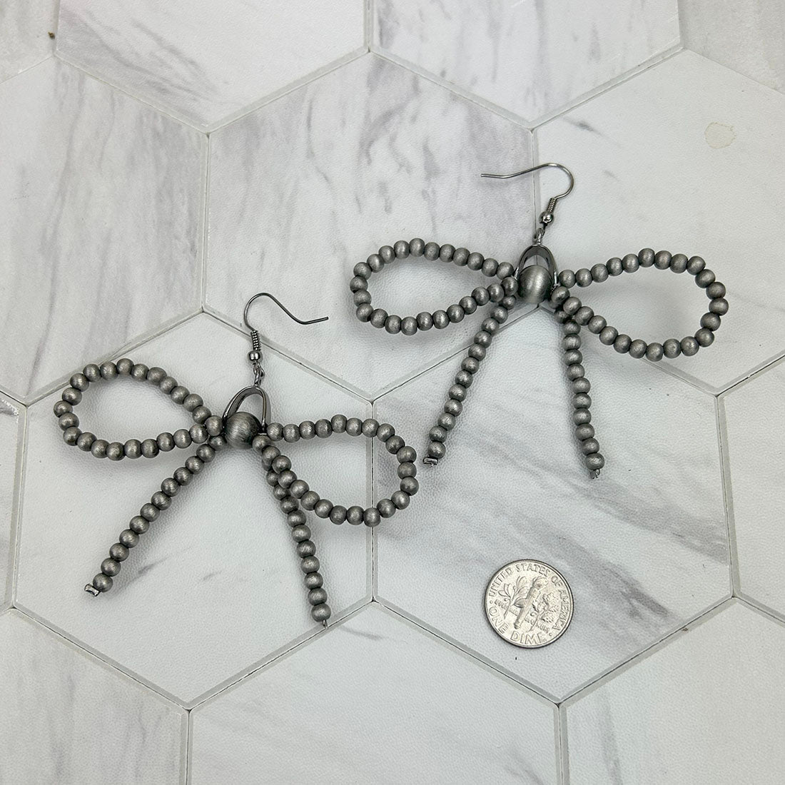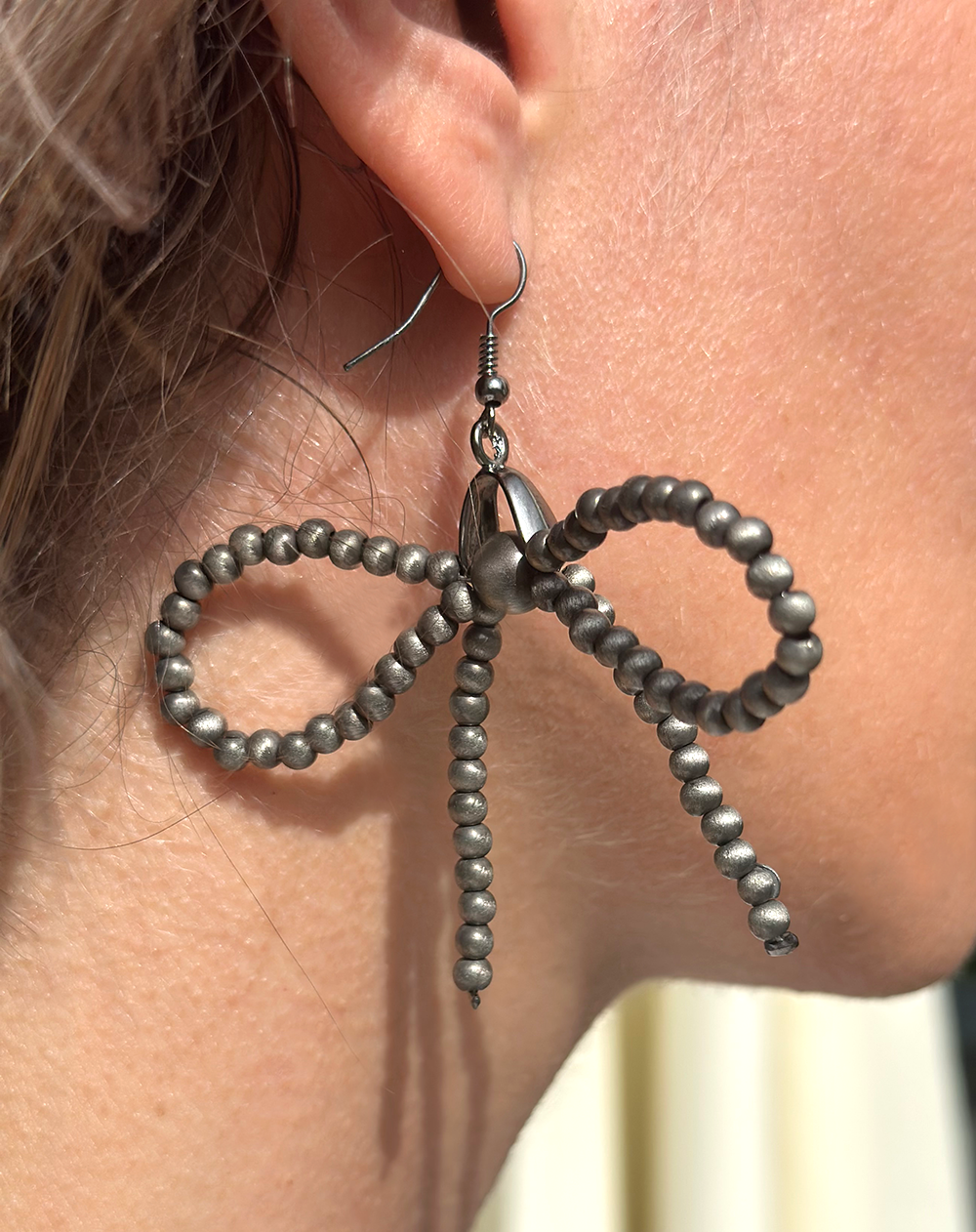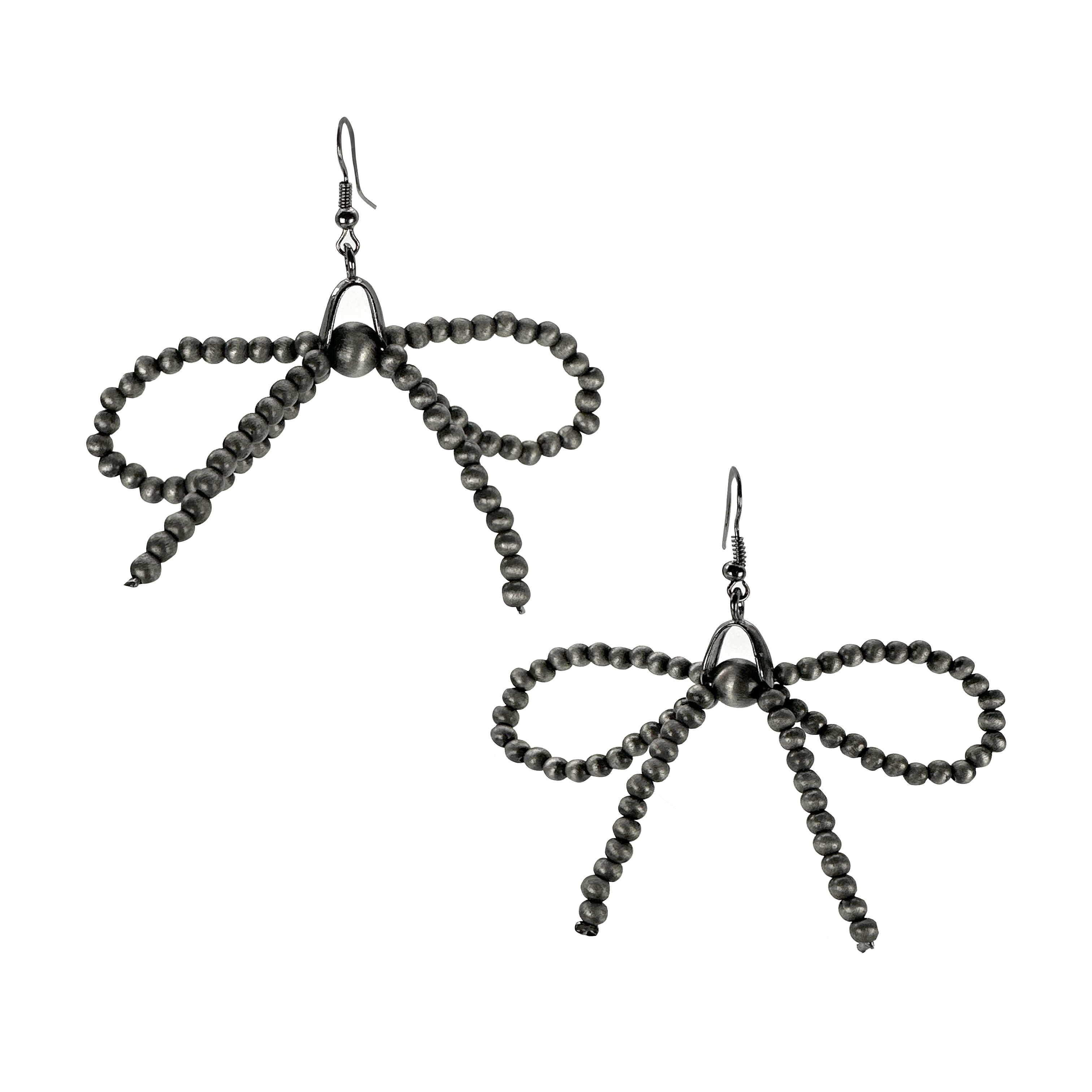 These bow tie earrings combine classic Western charm with a playful, feminine twist. Handcrafted with the timeless look of oxidized silver Navajo pearls, each earring features a bow design. Lightweight yet eye-catching, they feature intricate beading, making them the perfect accessory to dress up your everyday western wear or to add a polished touch for special occasions. These earrings embody the spirit of Western tradition while offering a unique and stylish flair.