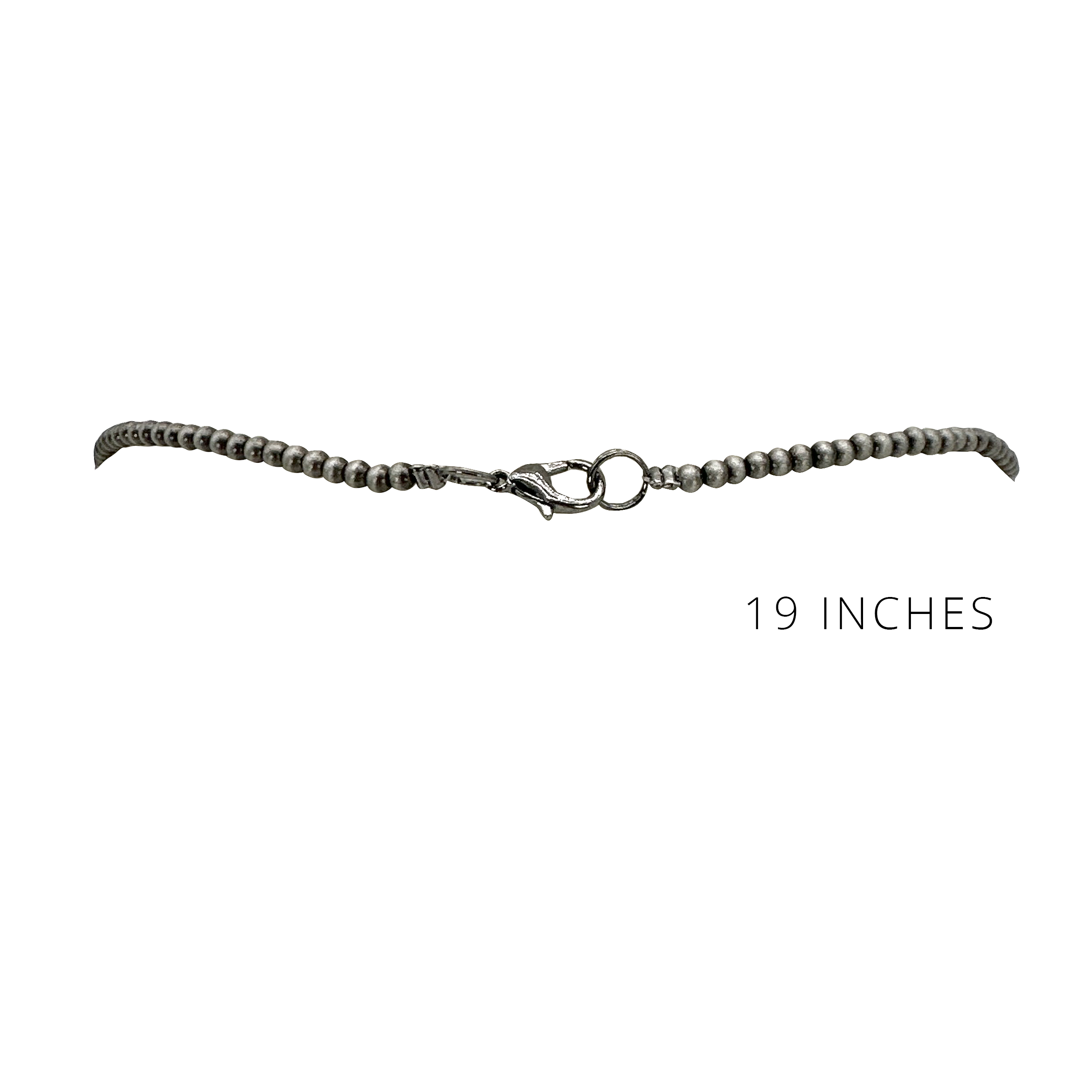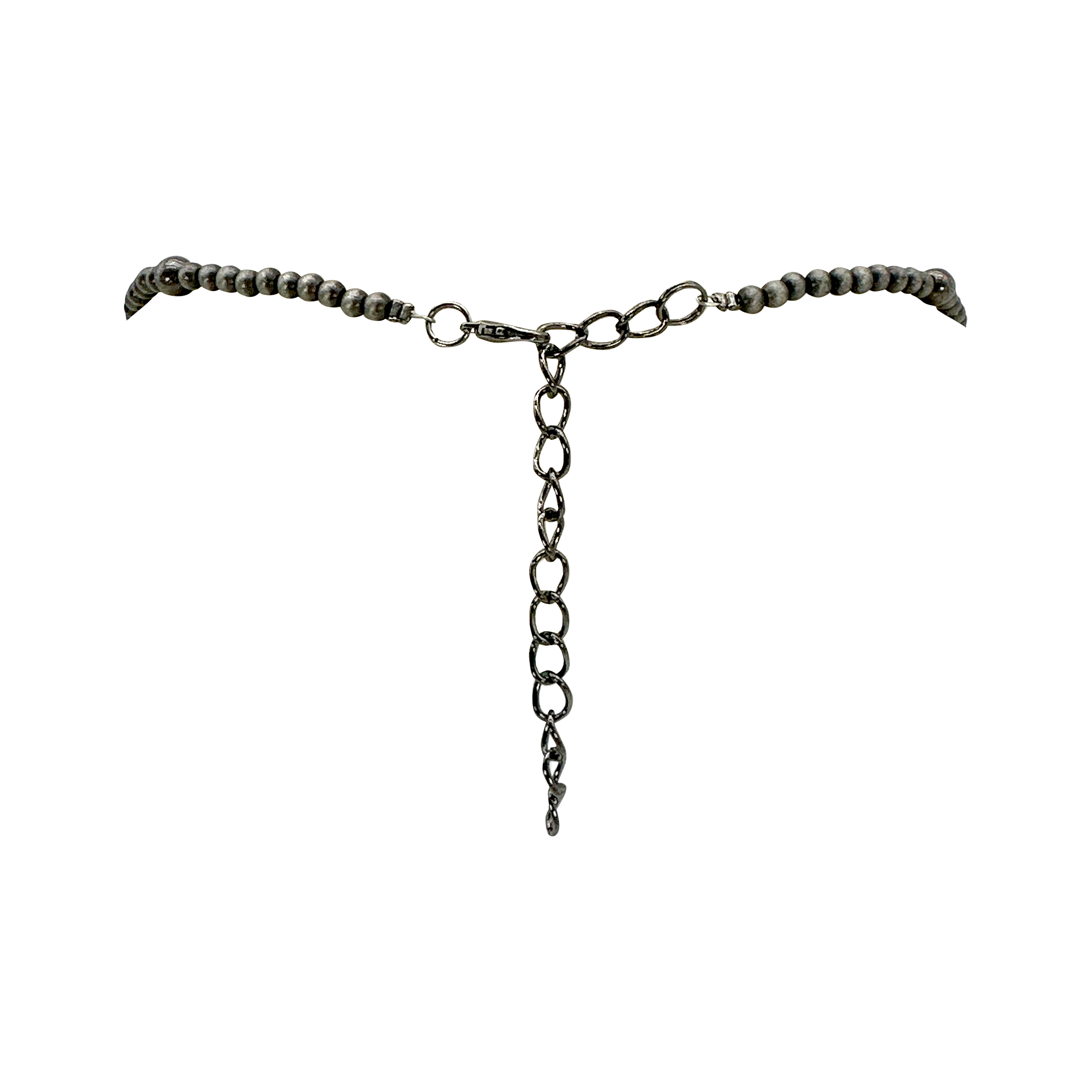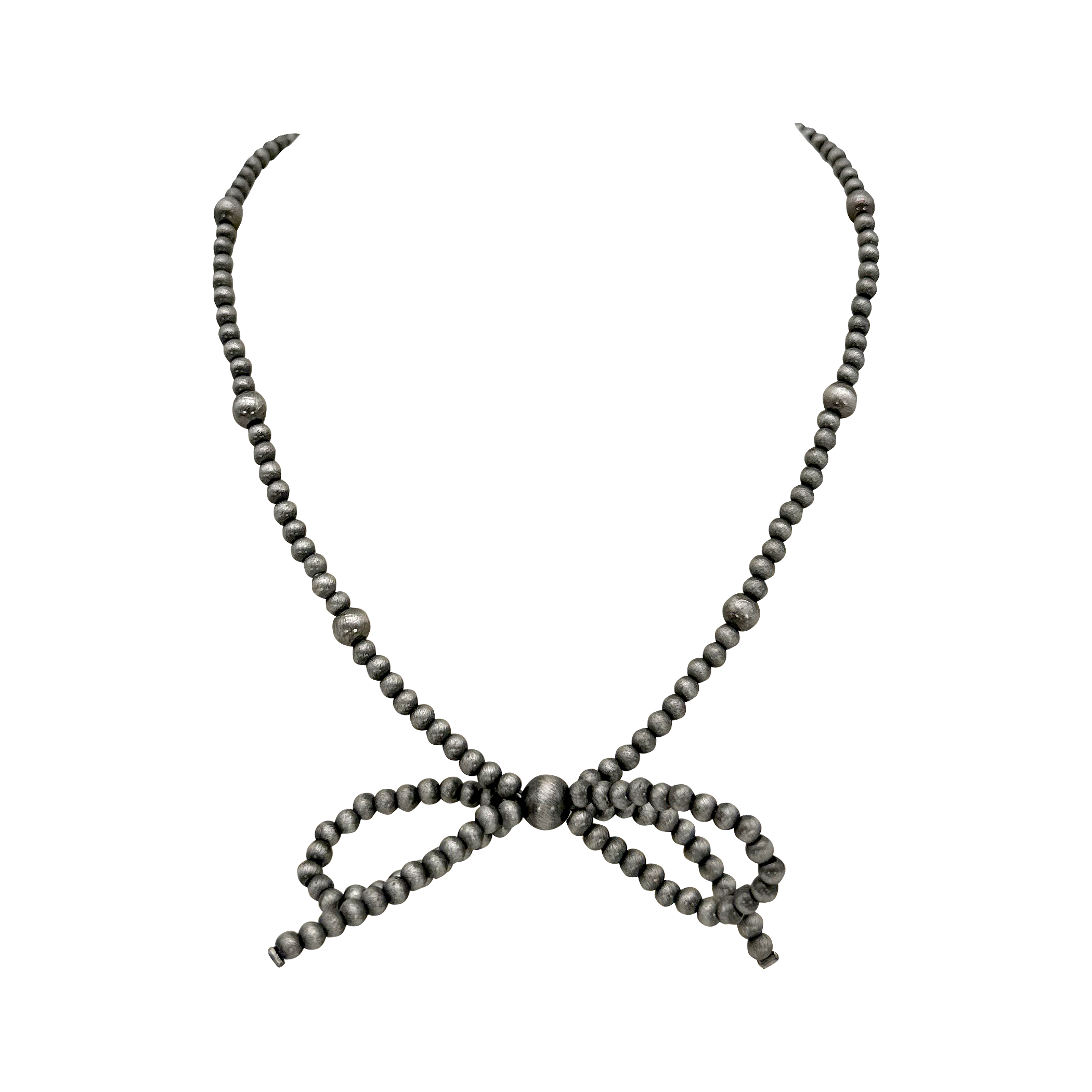 This 16-inch bow tie necklace beautifully blends timeless Western elegance with a feminine, modern flair. Handcrafted with oxidized silver Navajo pearl beads, it features a delicate bow design at the center, creating a striking yet sophisticated statement piece. The intricate beading adds texture and depth, while the oxidized finish offers a vintage charm. Lightweight and versatile, this necklace pairs perfectly with everyday Western wear.