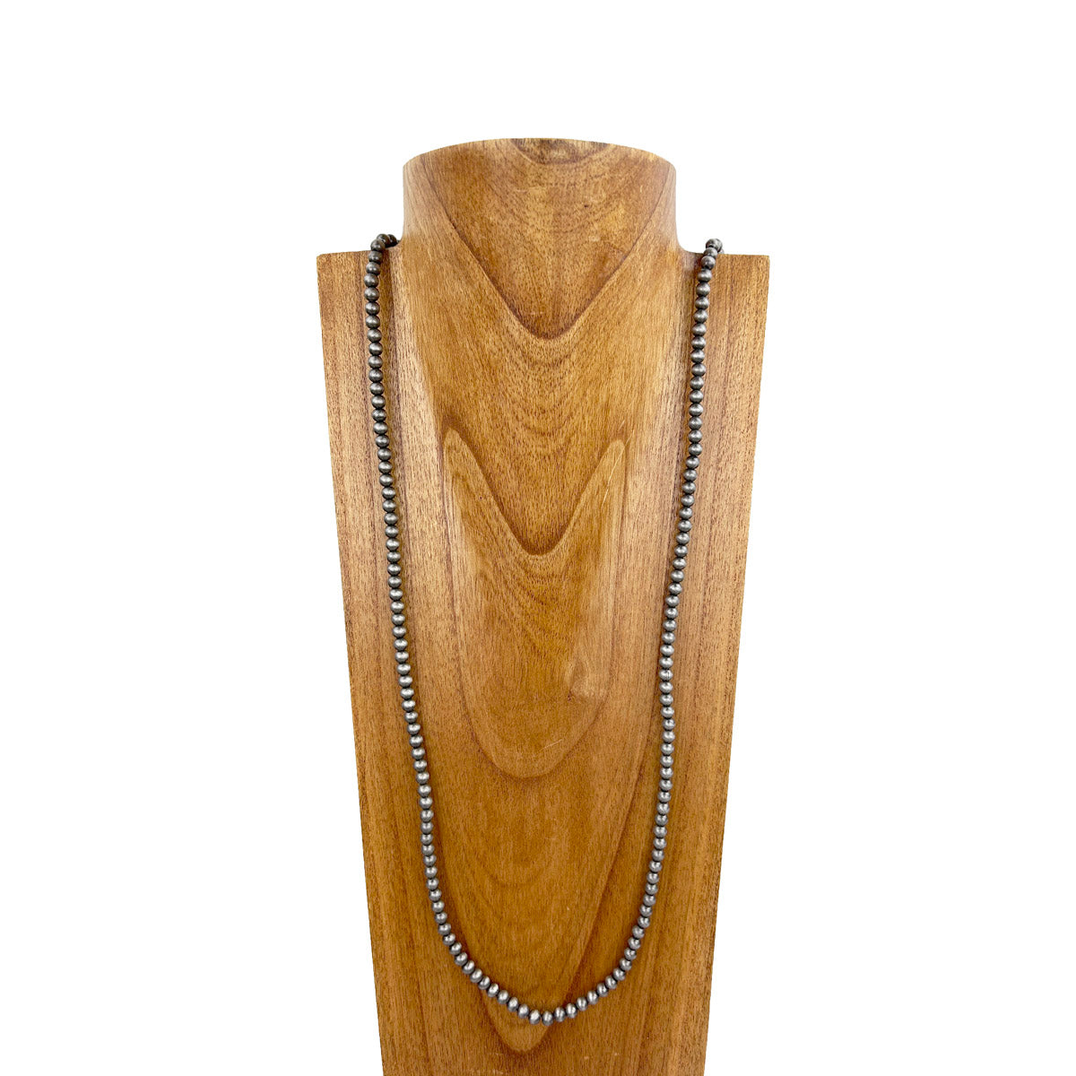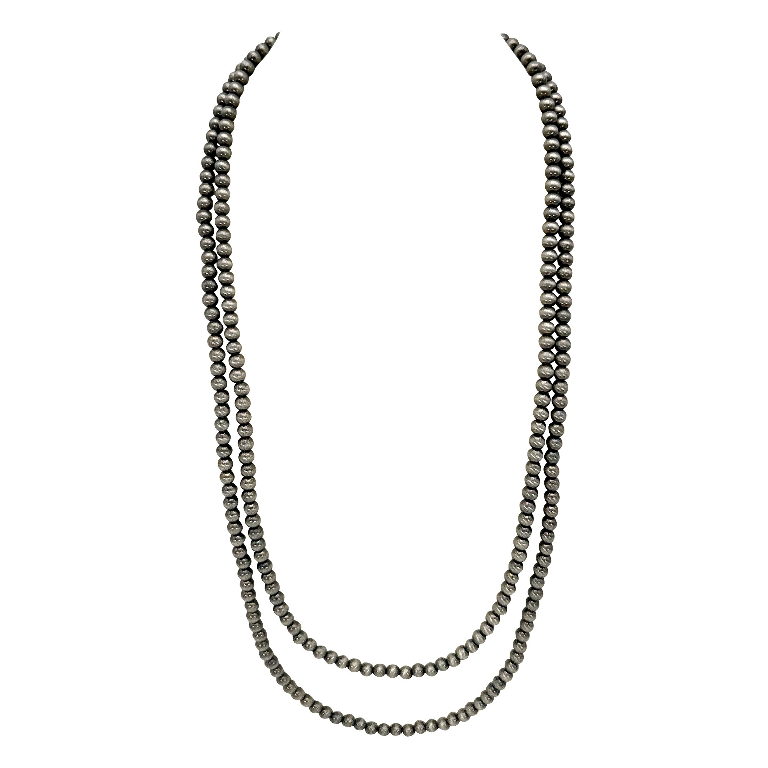 This 60-inch silver-tone Navajo-style pearl bead necklace is a stunning blend of classic Western heritage and modern simplicity. Strung with beautifully uniform 6mm beads, it offers a lightweight feel without sacrificing visual impact. Designed for versatility, you can wear it long or doubled for a layered look. The smooth, oxidized finish on the beads gives it a timeless, vintage charm—making it an elegant statement piece whether worn solo or stacked with other favourites.