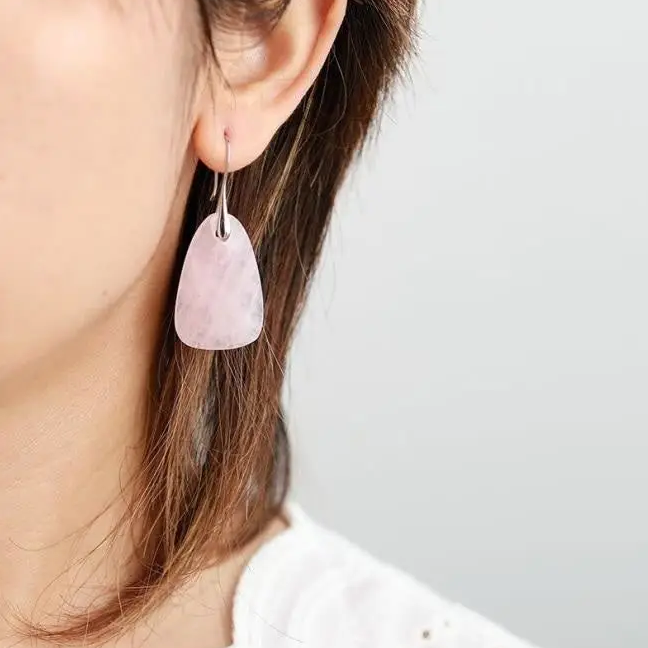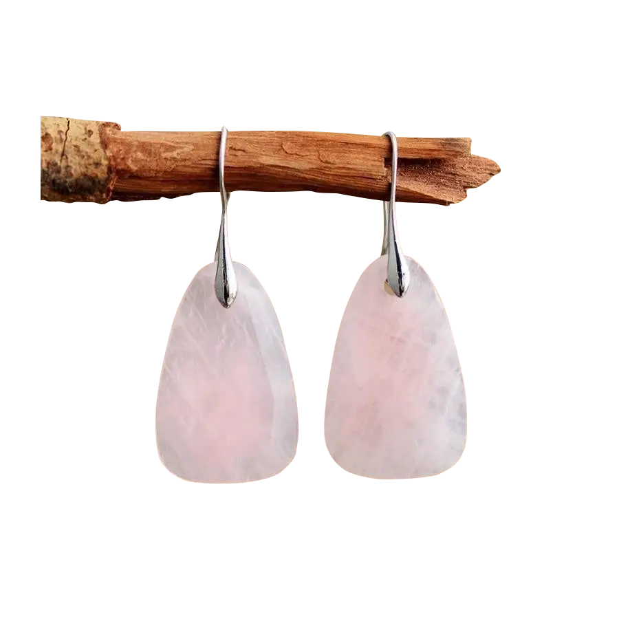 These earrings possess a natural charm and beauty, adding a touch of elegance to your ensemble. Each earring features a soft pink rose quartz stone, carefully shaped and polished to highlight its delicate, calming hue. Measuring approximately 5cm in length, the drop design creates a graceful silhouette that complements any outfit. The suspended stone hangs from a durable zinc alloy hook. These earrings are not just accessories—they're meaningful pieces of wearable art designed to bring peace, style, and subtle sophistication to your day.