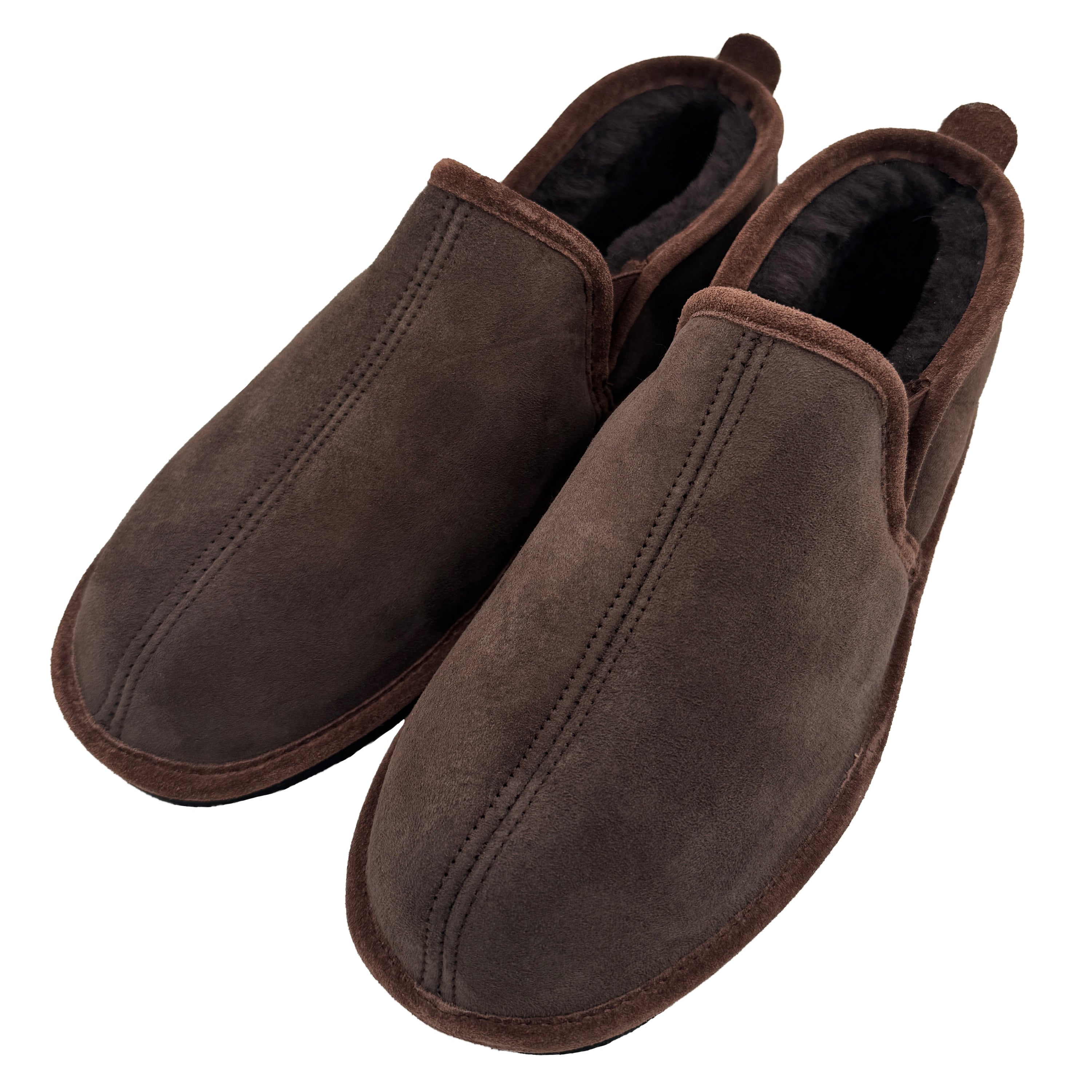 Made in Canada, these cozy men’s 3E wide-fit reverse sheepskin slippers are one of just two lined wide styles we offer. The rich chocolate brown suede is fully lined with soft sheep’s wool for comfort, with elastic panels on both sides of the opening and a suede pull tab at the heel help to make them easy to slip on.