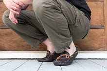 These moccasin slippers are available in men's sizes 7-13. They fit true to size. For half sizes, go down to the nearest whole size. (10 ½ order a size 10)