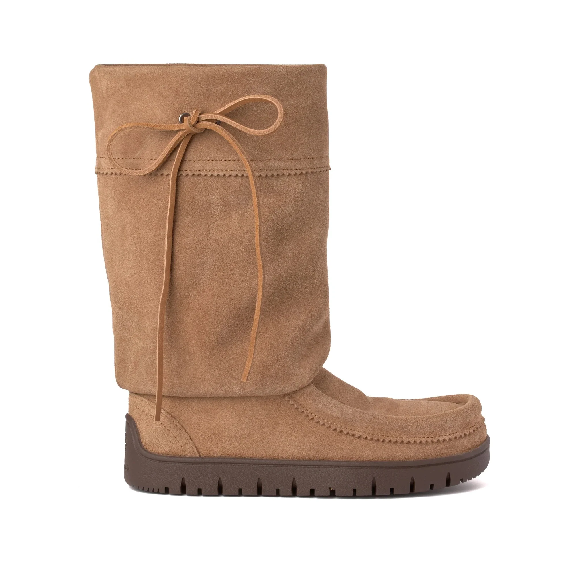 This woman's waterproof Hunter winter boot features a classic suede mukluk silhouette and a cozy shearling lining, set on the Two Rivers sole, designed by Diné artist Tracie Jackson. Featuring left and right footbeds, it delivers a more natural fit with better traction, added structure, and all-day comfort. The 12" fleece-lined shaft provides added insulation and comfort up the leg. An adjustable tie detail offers both coverage and a customizable fit. In contrast, the 16" shaft circumference allows for easy layering over socks or leggings.