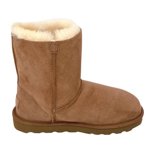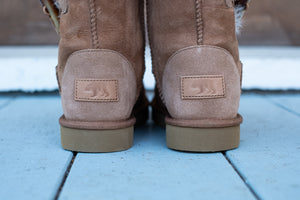 These sheepskin winter boots offer premium warmth and all-day comfort. Please enjoy our blog featuring these sheepskin boots "The Hygge Life". They are crafted from a combination of water resistant, highest-grade natural Australian sheep suede on the outside and thick reverse shearling fur on the inside. They are the same style as the UGG Keely discontinued boot. These' women's sheepskin boots have a stylish antler toggle button as a side closure for style and convenience. The sole on these ladies sheepskin winter boots is made of soft and flexible rubber, which provides extra cushioning while insulating your feet from the cold ground. The boot shaft height (which includes outer sole) is 10" (250mm) tall. These boots come in a Chestnut brown colour and we carry women's sizes 5 to 11.