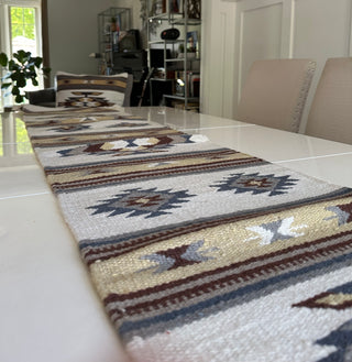These table runners are a beautiful and unique statement for your dining room or kitchen. These handwoven wool runners measure 16" x 80" and feature stunning Southwestern designs that bring warmth and character to any space. Crafted carefully, each runner showcases intricate patterns and vibrant, rich colours, making it a perfect addition to your dining table, console, or sideboard. The high-quality wool construction ensures durability and timeless appeal. Whether you're setting the scene for a festive gathering or adding a cozy touch to everyday décor, this table runner adds a touch of Southwest-inspired charm to your home.