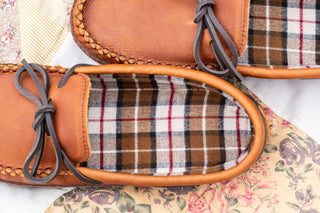 "Staycation Mode" to find out what makes these moccasins so special, along with additional product photos. Handmade in Canada from genuine cowhide, they feature a stylish two-tone design—wood-stained leather uppers paired with rich chocolate brown suede accents—for a distinctive, boat shoe-inspired look. Built for both style and comfort, they include a double hand-stitched vamp and functional laces for a customizable fit. The durable outdoor rubber sole makes them ideal for casual wear, as they are easy to slip on and off. Inside, a memory foam insole lined with a soft tartan wool blend provides cloud-like comfort. Inspired by Native American design, these moccasins are both flexible and durable. The high-quality leather moulds to your feet over time, enhancing the fit with each wear. Available in men's sizes 8–13. They fit true to size. If you wear a half size, order the next full size up (10½ order size 11).