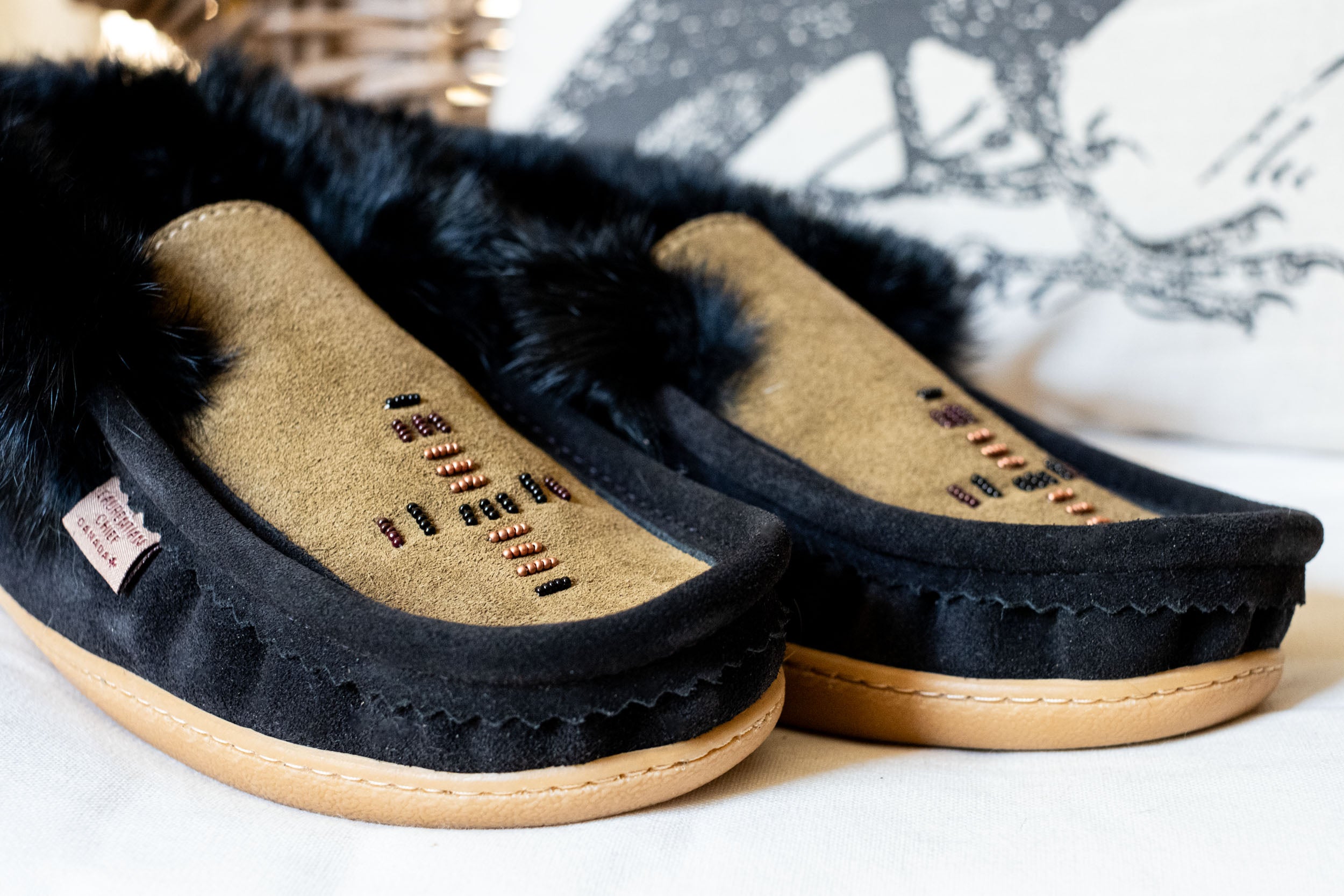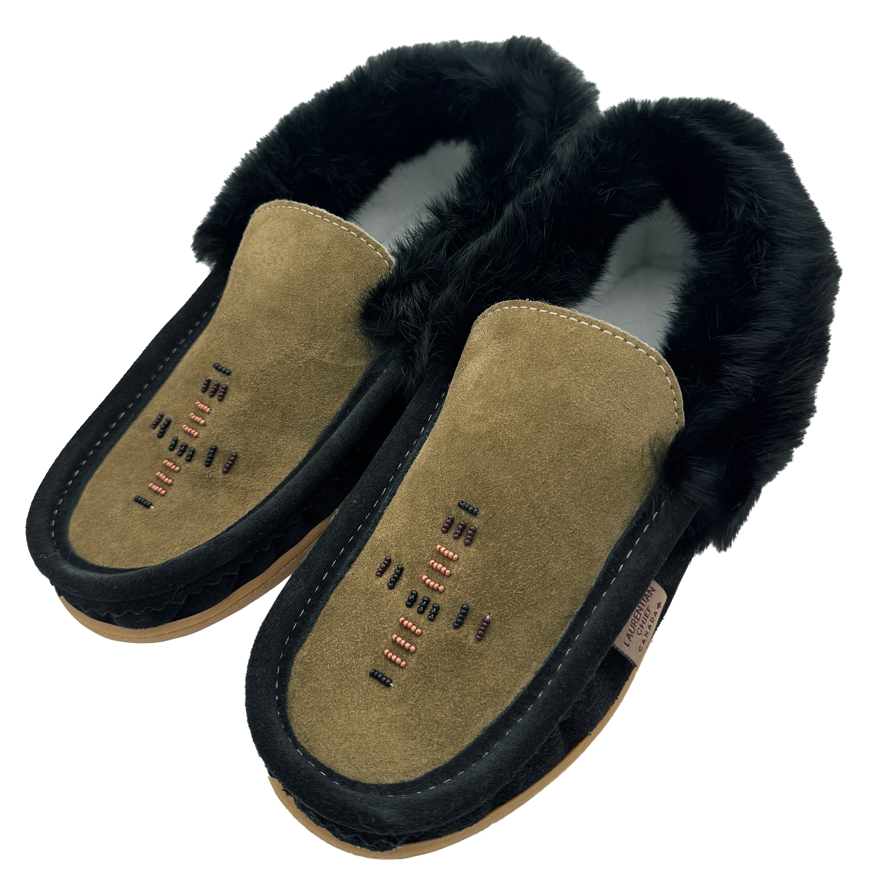 These unique men's Canadian-made slippers are easy to slip on for immediate comfort. They feature real fuzzy rabbit fur around the opening of the moccasins; however, the suede vamp cuts through the fur trim, creating a sleek surface accented with hand-stitched beadwork. For additional details and more product photos visit our blog,
